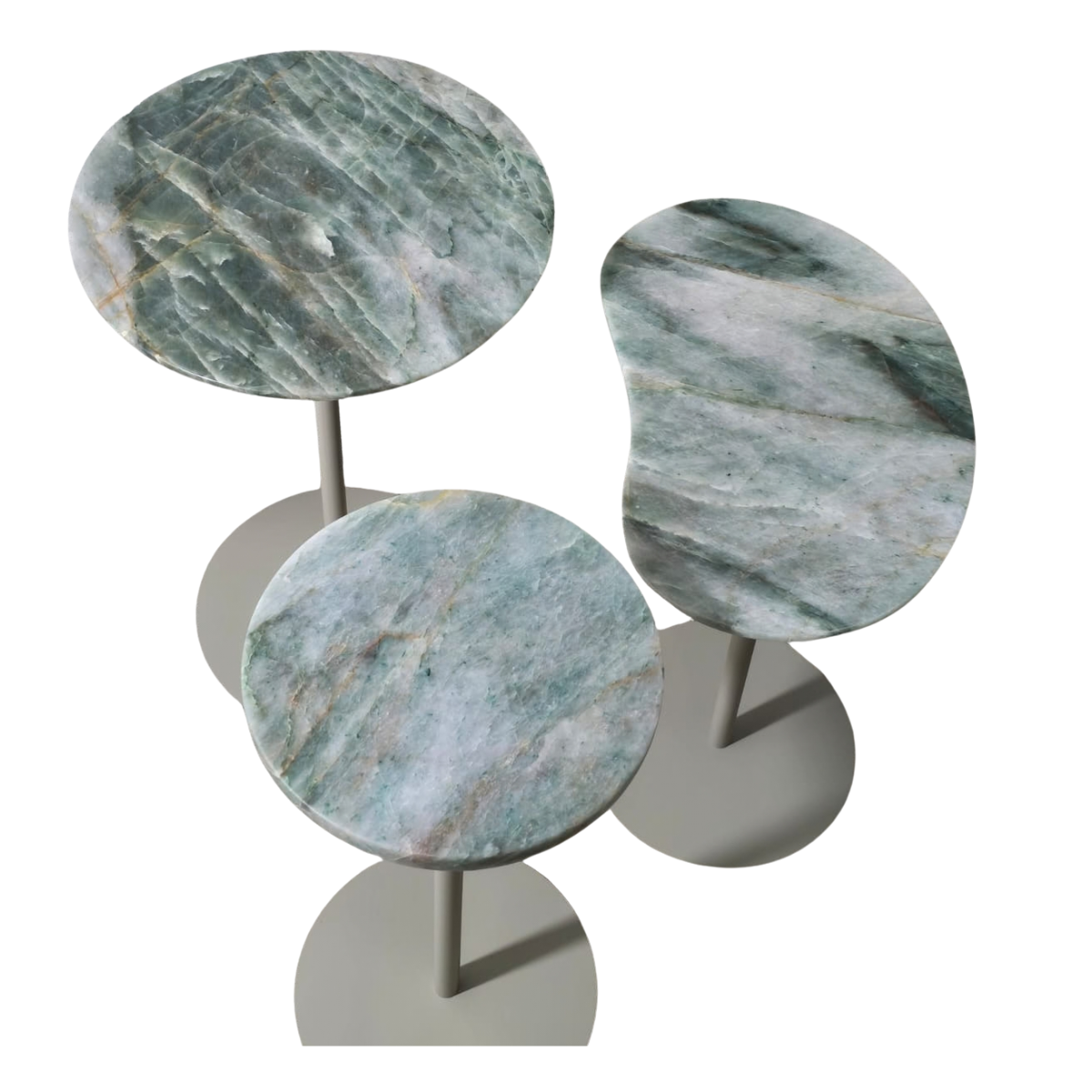 O tampo é produzido em mármore natural, com veios únicos que tornam cada peça exclusiva. As formas orgânicas garantem leveza visual e design diferenciado, enquanto a base metálica proporciona estabilidade e resistência para o uso diário. O conjunto conta com três mesas em alturas diferentes, permitindo composições dinâmicas e funcionais no ambiente.